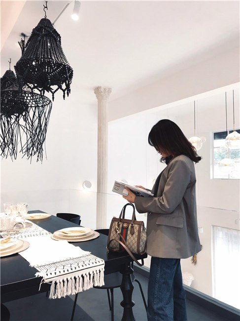 The world of Ophidia evolves with the introduction of a small top handle tote with a detachable shoulder strap. Crafted in GG Supreme canvas with inlaid green and red Web stripe, the accessory is enhanced by a petite play on the Double G, an archival Gucci code from the ”70s that appears atop a leather tab detail and on the zipper pull.