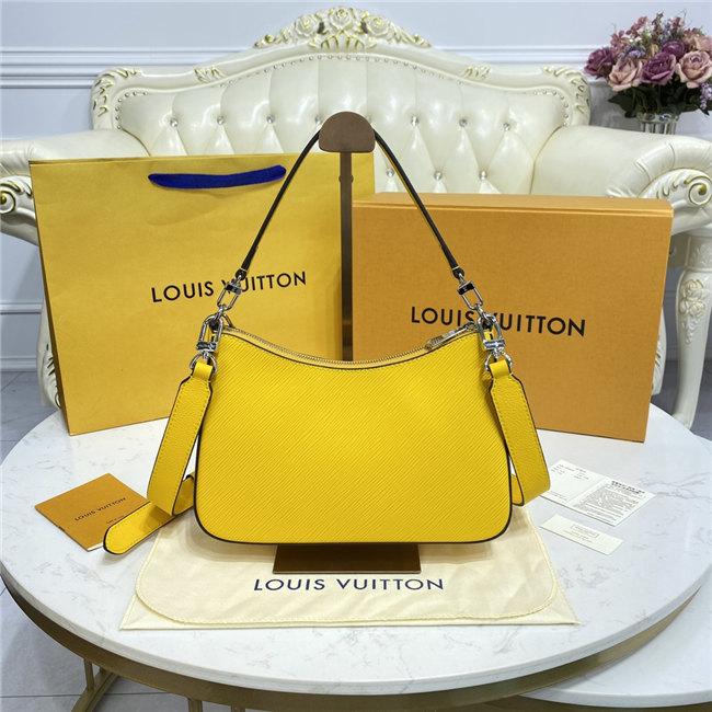 The trendy Marelle is fashioned from grained Epi leather, endowed with a detachable canvas pouch attached to the bag thanks to a silver chain. This subtle touch of Monogram is visible thanks to the LV see-thought crafted in the front pocket of the bag. The Marelle can be carried by hand, elbow or shoulder with its detachable top handle, or worn as a cross-body thanks to its removable and adjustable leather strap.