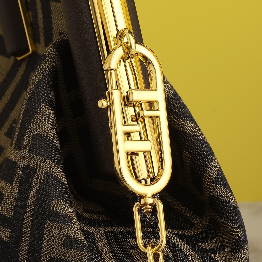 Introducing the brand new FEND1 First! Designed under the leadership of designer Kim Jones, this is the first Fend1 bag that breaks away from traditional bag shapes. The combination of metal edge detailing, a large logo lock closure, and the overall bag design integrates architectural deconstruction with fashion, exuding elegance with a touch of edginess that instantly catches the eye! Whether hand-held for a formal dinner or slung across the body, it brings a sense of high-end street chic.