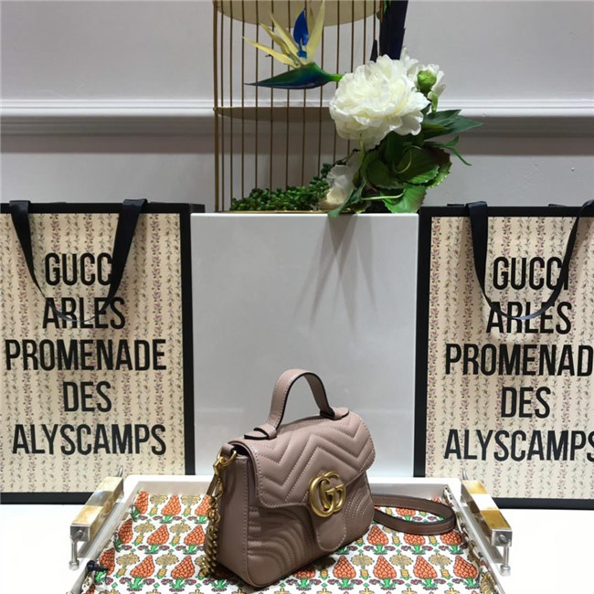 A new introduction to the GG Marmont line for Cruise 2019, the mini GG Marmont top handle bag has a softly structured shape and an oversized flap closure with Double G hardware. Equipped with a leather top handle and chain shoulder strap, made in matelassé chevron leather with a heart on the back.