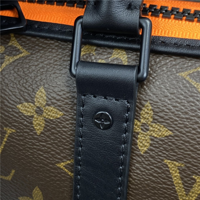 A compact version of the House’s original soft travel bag from 1930, the Keepall XS bag for men pairs Monogram canvas with black matte leather. The classic Louis Vuitton look is enlivened with a touch of florescent orange along the zipper and an embroidered patch of a cartoon LV friend from Virgil Abloh’s “Zoom with friends” animated film.