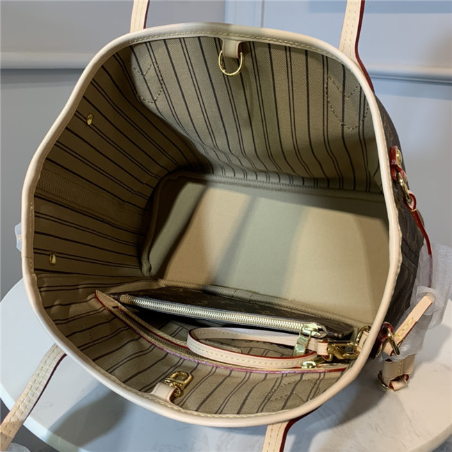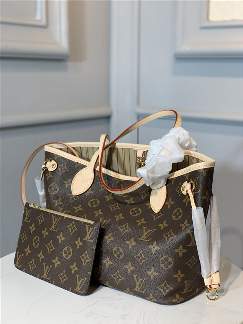 The Neverfull PM tote pairs timeless design with heritage details. Crafted from Monogram canvas with natural cowhide trim, it is capacious yet not bulky, with side laces that cinch for a sleek allure or loosen for a casual look. Slim, comfortable handles slip easily over the shoulder or arm. Lined in colorful textile, it features a removable pouch which can be used as a clutch or an extra pocket.
