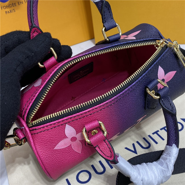 The charming Papillon BB handbag is arrayed for Spring in a new gradient colorway of Monogram canvas, featuring a graphic oversize motif. A round coin purse snaps on to the wide jacquard strap, adding a playful touch. For a dressier look, the strap can be detached and the bag carried by its classic Toron top handles.