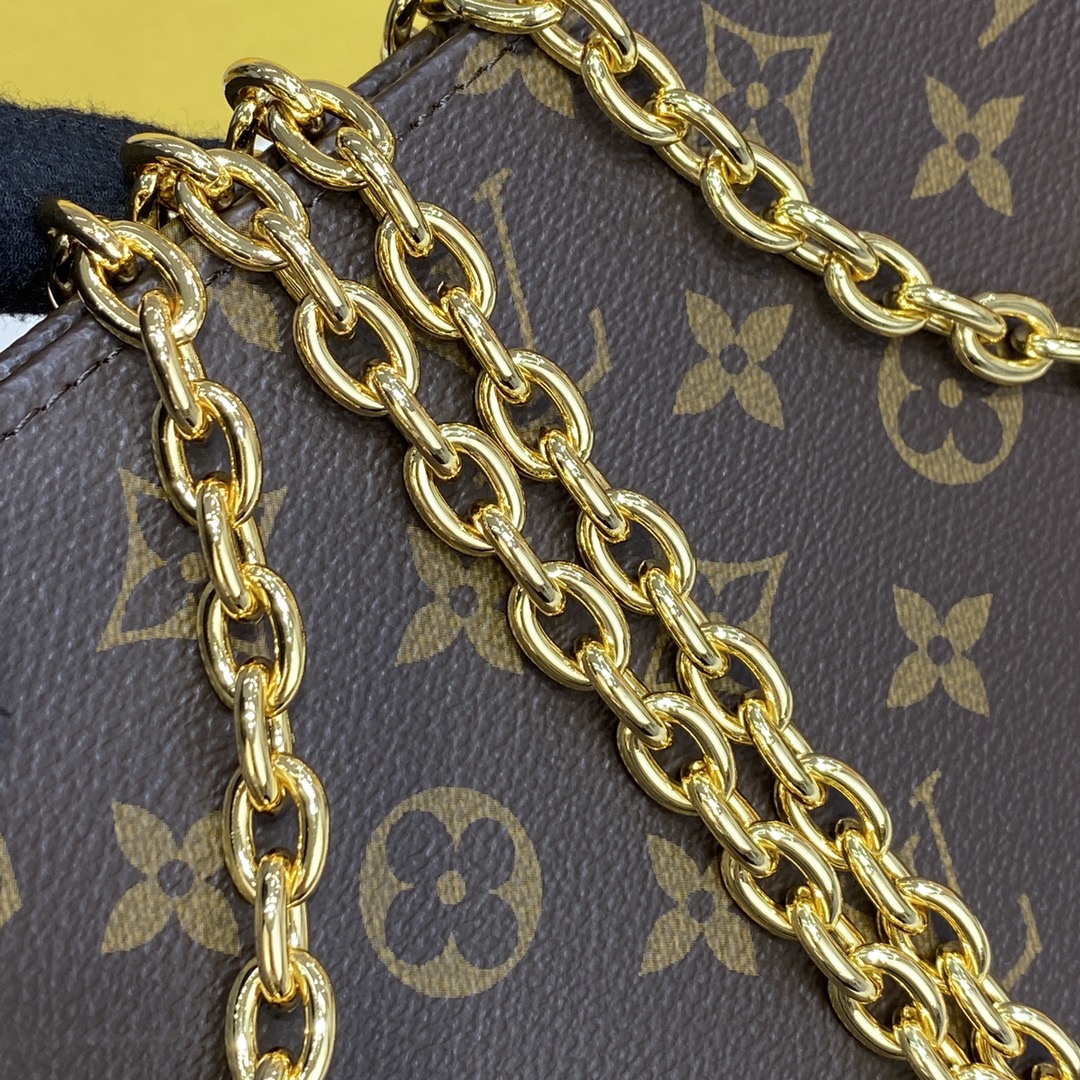 The Toiletry Pouch On Chain was inspired by the Monogram Toiletry Pouch cosmetic pouch, created in 1901, which Louis Vuitton clients also used as a clutch. This reworked design adds a removable chain and refined natural leather trim to create a fashionable bag, which can be carried in the hand or on the shoulder. Concealed inside is a smaller version of the pouch, which can also be used separately.