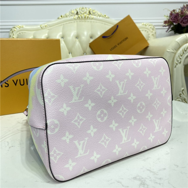 The NéoNoé bucket bag comes in Tie-Dye Monogram canvas for the LV Escale Collection. Present across Louis Vuitton handbags, shoes and ready-to-wear this season, this unexpected motif is inspired by the Japanese Shibori technique of knotting fabric before dyeing it. A lightweight bag, with a removable strap for a shoulder or cross-body carry.