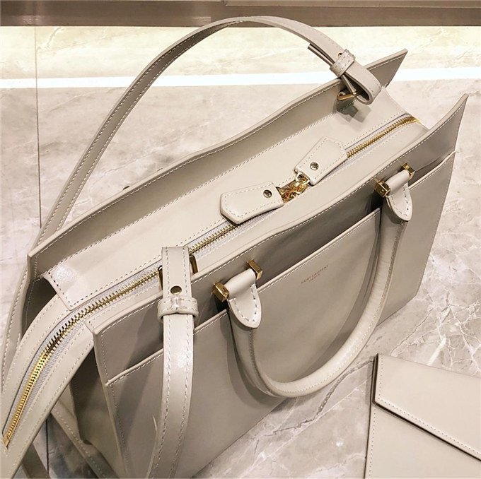 TOTE BAG WITH LEATHER HANDLES, A REMOVABLE SHOULDER STRAP AND A REMOVABLE ZIPPERED MAGNETIZED CLUTCH, DECORATED WITH METAL YSL INITIALS.